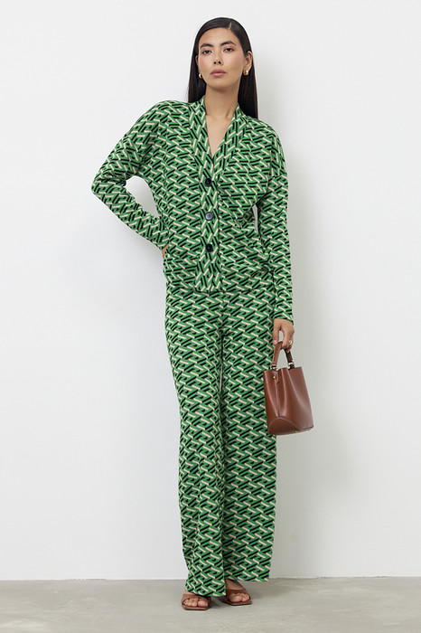 Костюм выполнен из эластичной ткани с жаккардовым узором. Брюки прямого силуэта. Пояс притачной с эластичной резиной. Кардиган свободного силуэта с притачной планкой и застёжкой на пуговицы. Втачной длинный рукав в спущенную пройму.