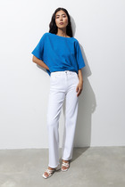 Блуза из вискозной ткани с крэш-эффектом. Свободный крой асимметричной длины (спинка удлинена относительно переда). Спущенное плечо. Линия проймы, линия горловина и низ изделия окантованы косой бейкой из основной ткани. Изюминкой являются оригинальные складки на передней и задней части изделия.