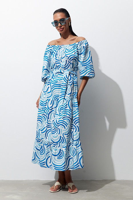 Платье свободного силуэта из хлопковой ткани, отрезное по линии талии. Нижняя части платья с воланами. Рукав-реглан до локтя. По низу рукава сборка на резину. Линия плеча и линия горловина оформлены сборкой на резину. В комплекте пояс из основной ткани.