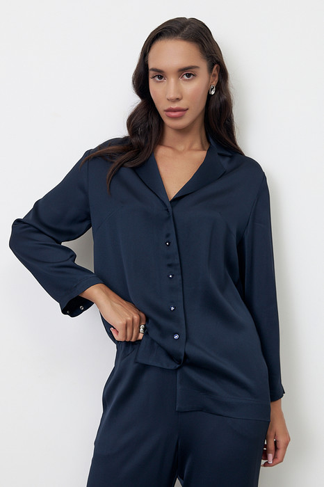 Блуза из вискозной ткани с сатиновым блеском. Свободный силуэт с английским воротником. Английский воротник визуально сделает фигуру стройнее, скроет недостатки и подчеркнет красивую линию груди. На передней части изделия застежка на пуговицы. Втачной длинный рукав. Низ рукава украшен декоративным элементом, который при желании можно отстегнуть. Перед стиркой декоративный элемент с перьями необходимо снять.