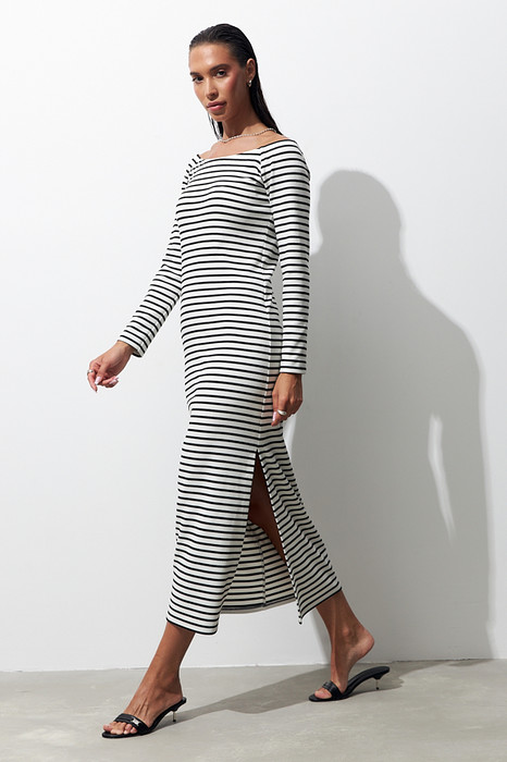 Платье из эластичного полотна прилегающего силуэта с разрезом в боковом шве. Длинный рукав-реглан. Линия плеча и линия горловины с эластичной резиной.