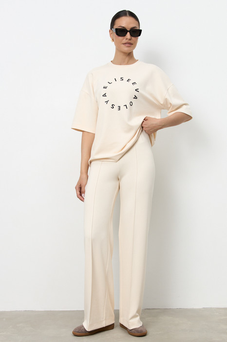 Брюки прямого силуэта из эластичного полотна. Пояс с эластичной резиной. На передней части брюк застрочены стрелки.
