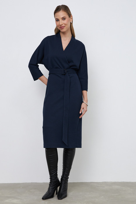 Платье из эластичного полотна. Изделие свободное в верхней части и прилегающее в области талии и бёдер. Лиф изделия оригинального кроя в стиле кимоно. Цельнокроеная стойка переходящая в запах, визуально делает фигуру стройнее. По центру задней части платья выполнен шов, снизу небольшой разрез. В комплекте пояс. В таблице размеров представлены параметры человека, а не изделия.