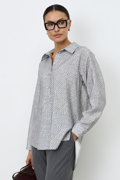 Рубашка свободного силуэта из вискозной ткани с застёжкой на пуговицы. Низ изделия асимметричной длины (спинка удлинена относительно переда) с закруглениями по бокам и разрезами. Рубашечный рукав на манжете с застёжкой на пуговицы. Вырез горловины обработан отложным воротником на стойке. На задней части изделия выполнена кокетка с небольшой складкой. Достоинство этой модели в способности скрыть некоторые недостатки фигуры. Её можно сочетать как с брюками, так и с джинсами.