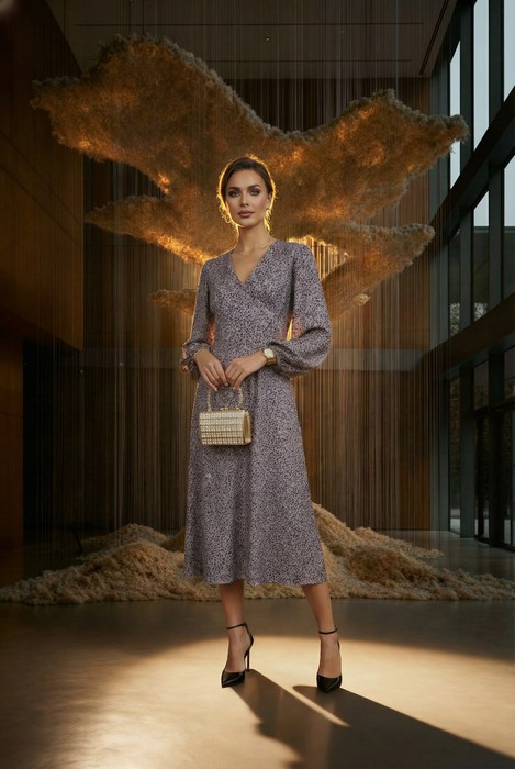 Платье из вискозной ткани полуприлегающего силуэта, расширенное книзу. Крой платья-по косой. На передней части изделия выполнен фигурный подрез в области груди, со сборкой. V-образный вырез горловины оформлен косой бейкой. Втачной длинный рукав, по низу рукава сборка на резину.