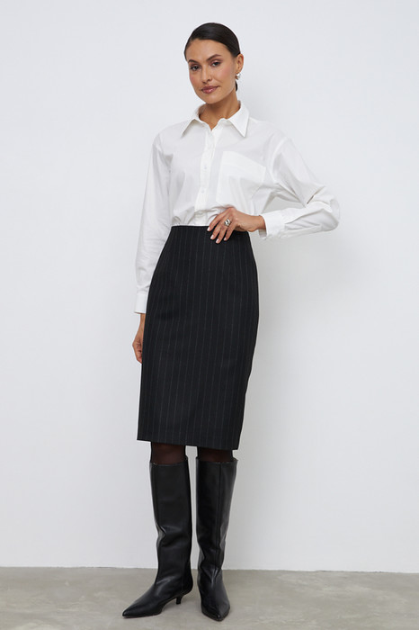 Юбка прилегающего силуэта из костюмной ткани. Сзади по среднему шву застёжка-молния, снизу шлица с разрезом. Изделие без пояса, верхний срез обработан обтачкой. На передней и задней половине юбки выполнены талиевые вытачки. Юбка на притачной подкладке.