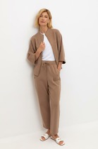Костюм из эластичного полотна. Брюки прямого силуэта. Пояс с эластичной резиной. На передней части брюк застрочены стрелки. Жакет прямого свободного кроя с женственным шалевым воротником. На передней части изделия накладные карманы. Втачной рукав. В комплекте пояс из основной ткани, позволяющий создавать приталенный силуэт. Изделие с плечевыми накладками, которые при желании можно убрать.