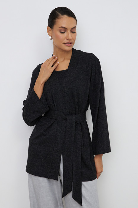 Кардиган из меланжевого эластичного полотна. Свободный силуэт с притачной планкой. Втачной широкий рукав в спущенную пройму. В комплекте пояс, позволяющий создавать приталенный силуэт.