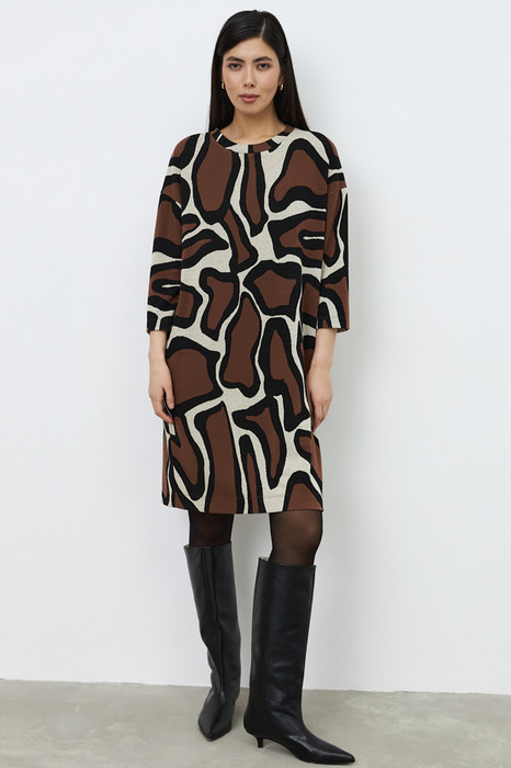 Платье из эластичного полотна свободного силуэта. Изделие со спущенной линией плеча и длинным рукавом. Вырез горловины оформлен бейкой из основной ткани. В таблице размеров представлены параметры человека, а не изделия.