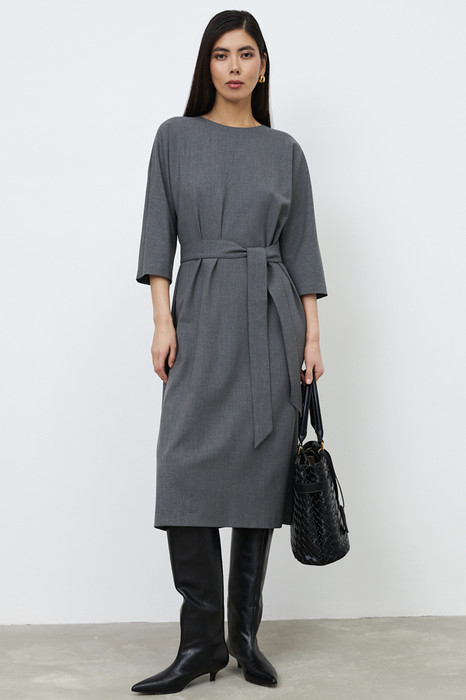 Платье из плательной ткани. Свободный силуэт, слегка прилегающий в области бедра. По спинке изделия выполнена застёжка на декоративные пуговицы, снизу-разрез. Цельнокроеный рукав 3/4. Круглый вырез горловины. В комплекте пояс, позволяющий создавать приталенный силуэт.