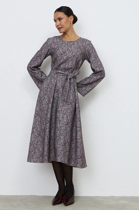 Платье из вискозной ткани свободного силуэта, расширенное книзу. Втачной широкий рукав. Круглый вырез горловины оформлен косой бейкой, сзади застёжка на петлю-пуговицу. В комплекте пояс из основной ткани. В таблице размеров представлены параметры человека, а не изделия.