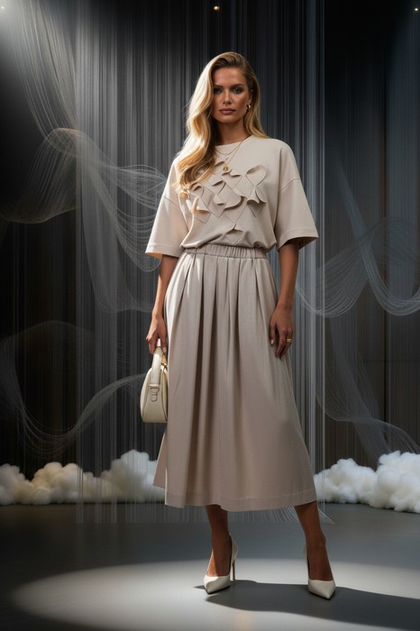 Юбка из вискозной ткани свободного силуэта со складками по линии талии. Пояс с эластичной резиной.