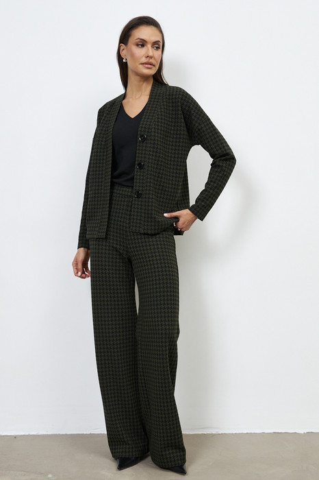 Костюм выполнен из эластичного полотна с жаккардовым узором. Брюки прямого силуэта. Пояс притачной с эластичной резиной. Кардиган свободного силуэта с притачной планкой и застёжкой на пуговицы. Втачной длинный рукав в спущенную пройму.