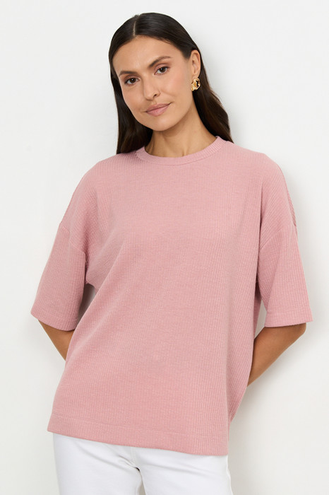 Джемпер из фактурного эластичного полотна. Свободный силуэт со спущенной линией плеча и коротким рукавом. Вырез горловины оформлен бейкой. В таблице размеров представлены параметры человека, а не изделия.