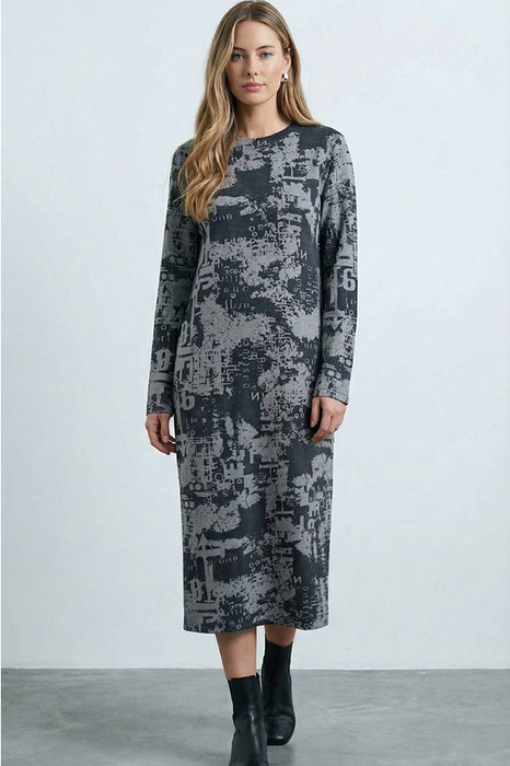 Платье полуприлегающего силуэта из эластичного полотна. Круглый вырез горловины оформлен притачной бейкой. Втачной длинный рукав.