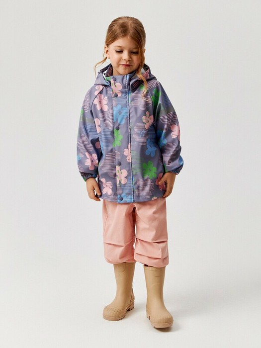 Детская куртка-ветровка для девочки выполнена из прорезиненной ткани с водонепроницаемым покрытием, которой не страшны дождь и ветер. Модель без утеплителя и подкладки прекрасно подходит для летних дождливых дней. По всей поверхности изделия нанесен принт в виде цветов и линий. Рукава покроя реглан подходят на разную ширину плеч, что обеспечивает комфортную посадку на разные типы фигур. Низ рукавов собран на резинку для лучшего прилегания к телу во избежание продувания. Спереди расположена застежка на молнию с внешней и внутренней ветрозащитными планками; внешняя планка застегивается на кнопки. Модель со съёмным капюшоном на кнопках универсальна при создании образов. На спинке снизу расположена надпись "OUTDOOR FRIENDLY" англ. - "Снаружи дружелюбно". Модель без карманов. Непромокаемая куртка-дождевик представлена в двух расцветках: темно-сером с принтом для мальчиков и сиреневом с принтом для девочек.