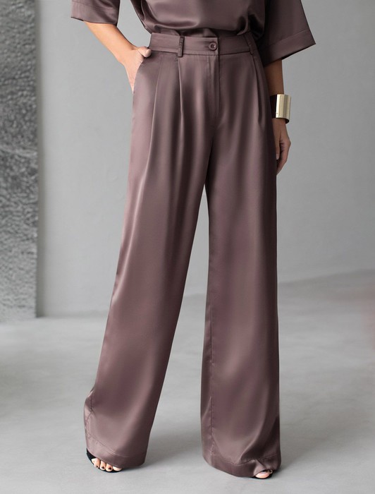Нарядные широкие брюки сочетают в себе красоту и функциональность, созданы для женщин, которые ценят дорогой внешний вид без лишних усилий, идеально подходят для создания праздничного образа, сочетая комфорт и элегантность. Брюки универсальны: их легко сочетать с блузками, топами или жакетами для создания образа как на событие, так и для повседневных выходов. Такой фасон остается актуальным вне зависимости от сезона или модных тенденций.