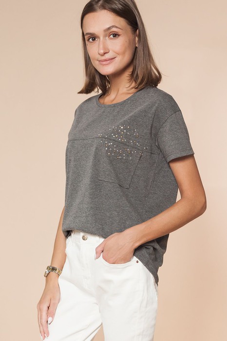Состав: 92%Хлопок 8%ПУФутболка с кокеткой спереди. С добавлением кармашка. Кармашек и часть кокетки украшены асимметричной группой страз нескольких форм и расцветок. Рукав с отворотоми, зафиксированными закрепками.