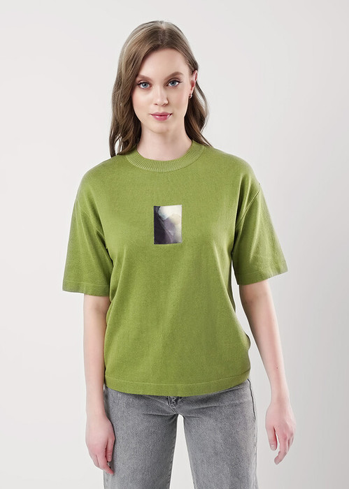 Вязаный джемпер умеренного объема из хлопковой пряжи с добавлением акрила. Короткий рукав со спущенной линией плеча. Длина рукава до локтя. Округлая горловина с бейкой. На детали переда нашивка.