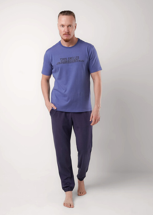 Набор мужской состоящий из футболки и брюк. Футболка из хлопковой кулирной глади с карбоном, коротким рукавом, декоративным резом и принтом. Брюки из плотной кулирной глади на широком поясе с резинкой и регулируемым шнуром, по бокам удобные карманы.