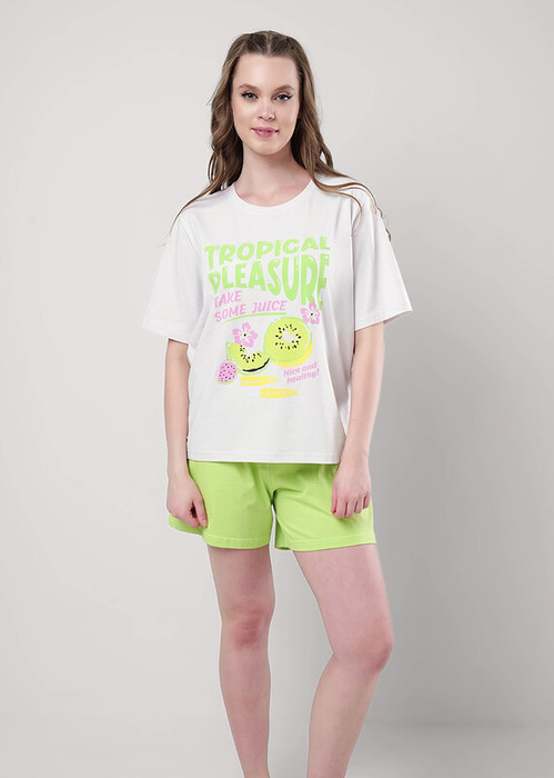 Пижама для дома из хлопкового трикотажного полотна.Футболка прямого кроя. Округлая горловина с обтачкой из кашкорсе. Короткий втачной рукав. На спинке внутренняя кокетка, застил. Шорты короткие,свободные. По талии притачная резинка жаккард, нашивка.