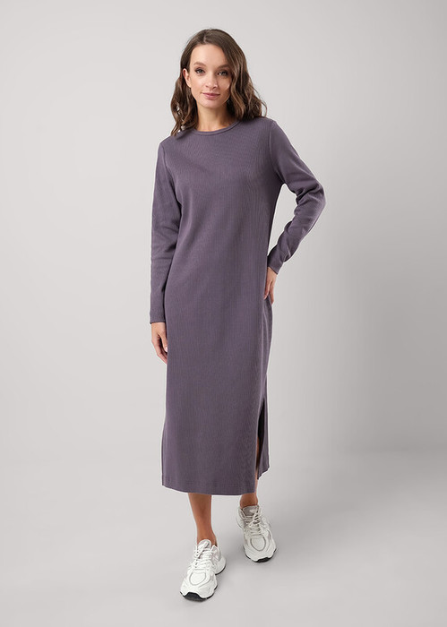 Платье из трикотажного эластичного полотна кашкорсе. Прямого силуэта длиной миди,по бокам разрезы. Округлая горловина с окантовкой. Длинный втачной рукав, внизу нашивка. На спинке принт.