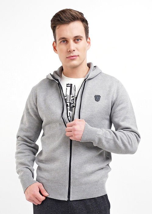 Вязаная джемпер на молнии. Изделие дополнено стильной кожаной нашивкой. Модель в комплекте с джинсами составит отличный вариант для прогулок.