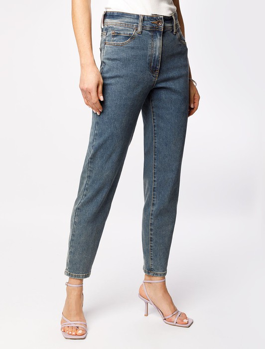 Состав: 94%Хлопок 6%ПУ Плотность: 14.5 OZ Параметры модели на первом фото: Рост 172, бюст 88, талия 64, бедра 88Джинсы mom-fit серо-голубого цвета с контрастными строчками выполнены из эластичного денима. Лаконичная модель с легкой стиркой хорошо впишется в непринужденный повседневный образ с вещами и нейтральной, и яркой гаммы. Комфортная посадка на талии подходит для любой фигуры, ткань хорошо тянется и не сковывает движений. Изделие дополнено классической задней нашивкой из бежевой эко-кожи с логотипом бренда.
