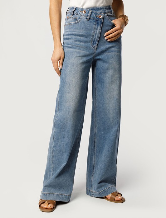 Состав: 70%Хлопок 28%ПЭ 2%ПУ Параметры модели на первом фото: Рост 172, бюст 88, талия 64, бедра 88 Размер товара на первом фото: 42Джинсы-трубы в синем оттенке выполнены из эластичного денима. Модель с трендовой ассиметричной застежкой и декоративной стиркой эффектом делаве. Свободный силуэт и акцент на талии визуально вытягивают силуэт и подчеркивают достоинства фигуры. Изделие дополнено брендированным патчем.