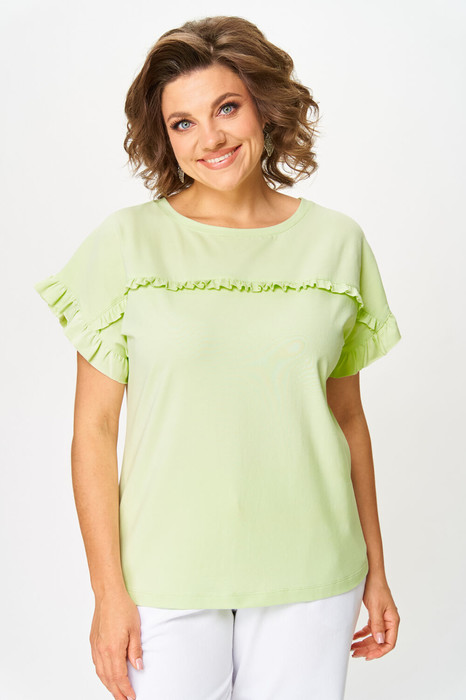 Джемпер женский прямого силуэта. Перед джемпера оформлен притачной кокеткой по полочке и спинке. В шов притачивания вставлена рюша. Спущенное плечо. Вырез горловины "круглый", оформлен бейкой.