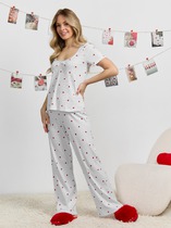 Халат женский из трикотажного полотна «кулирка» с набивным рисунком полуприлегающего силуэта, с горловиной овальной формы, окантованной основным материалом, короткими втачными рукавами с притачными манжетами. В боковых швах, смещенных в сторону полочки, обработаны карманы.