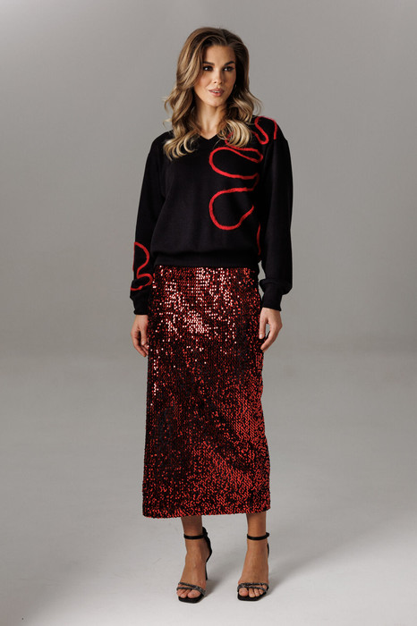 Эффектный комплект, состоящий из элегантного блузона с кантом и удлиненной юбки из трикотажного полотна с пайетками.
