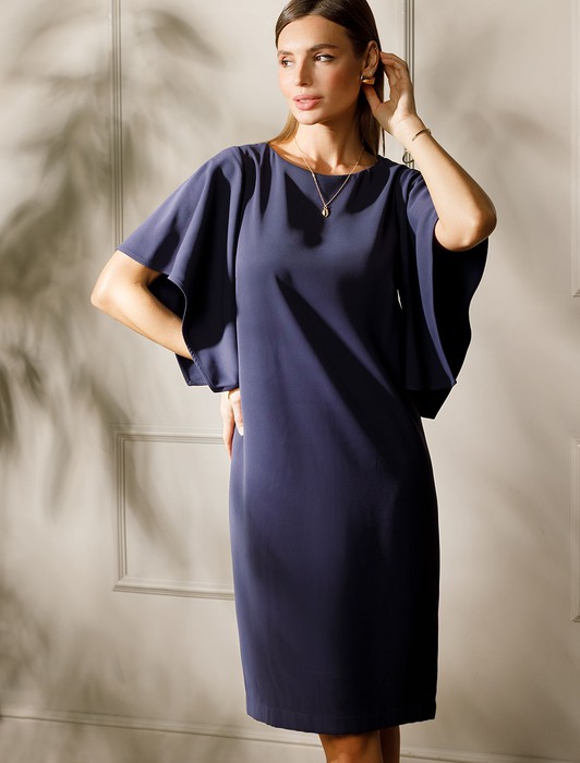 Состав: 69%ПЭ 23%Вис 8%Лиоцелл (Вис) Параметры модели на первом фото: Рост 172, бюст 88, талия 64, бедра 88Платье из плотного струящегося крепа прямого кроя с «парящими» рукавами. Фасон платья сбалансирует любой тип фигуры: прямой свободный крой, универсальная длина подола – чуть ниже колена, широкая пройма и акцентные рукава. Классический О-образный вырез фиксируется сзади изящной золотой пуговицей. Материал почти не мнется и комфортен в носке.