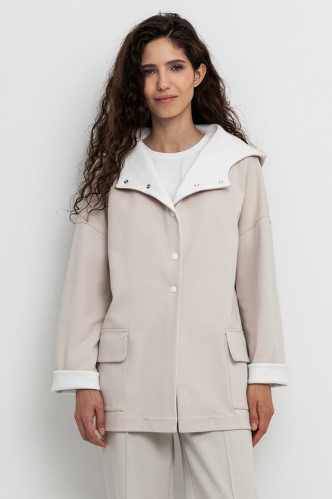 Женская куртка с капюшоном из плотного гладкого трикотажа интерлок со спандексом. Свободная модель с накладными карманами.  Гладкий и плотный материал на основе хлопка сохраняет форму.