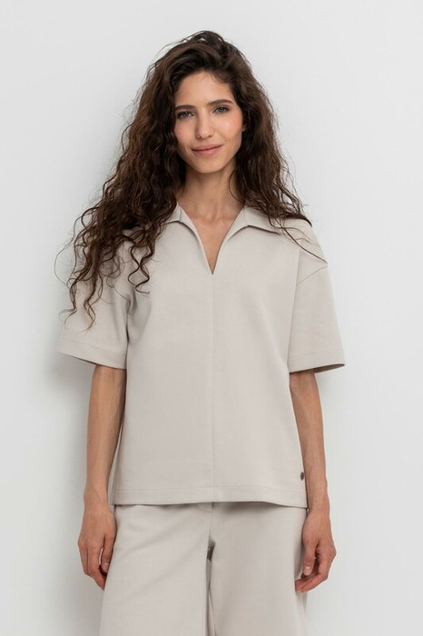 Джемпер поло с короткими рукавами из плотного гладкого трикотажа интерлок с V-образным вырезом . Спущенное плечо придает изделию свободный силуэт.