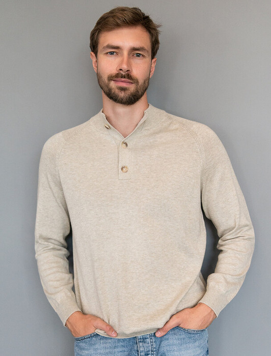 Черный джемпер с воротом, застегивающимся на черепаховые пуговицы, связали из мягкого хлопка с добавлением акрила; состав, который отлично согревает, не колется и при этом не перегревает тело, поэтому вещь получилась максимально комфортной для переменчивой погоды. Повседневный образ поддержат светлые брюки, синие джинсы и броги.