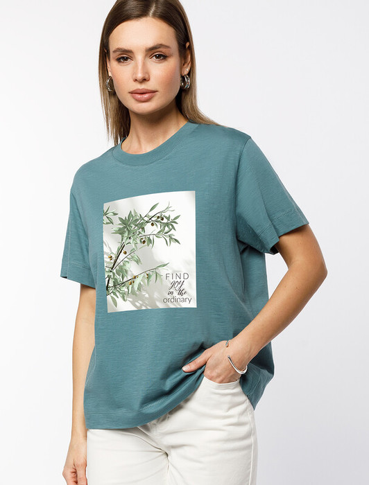 Совместные покупки Курган Женская одежда Футболки — Акция Vilatte Футболка из фактурного полотна с авторским принтом D49.071 полынь