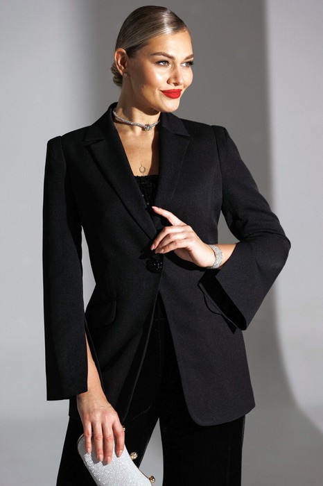 На передней части жакета обработаны вертикальные рельефы, идущие от проймы до уровня кармана и от кармана до низа, что придаёт силуэту выразительность и стройность. Воротник пиджачного типа добавляет классической элегантности. Застёжка центральная бортовая на петлю-пуговицу. Карманы в рамке с клапанами, гармонично расположены на передней части жакета. Спинка с центральным швом и вертикальными рельефами, идущими от проймы.Рукава двухшовные с отрезной деталью по окату и разрезами внизу добавляют свободы движению и делают модель более интересной. Жакет на подкладке. Утром Вы можете пойти в нем на деловую встречу, а вечером - на коктейльную вечеринку, просто сменив аксессуары.