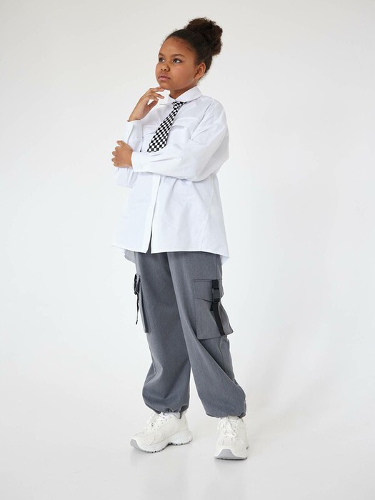 Удлиненная свободная блузка с большими карманами с клапанами на груди. Хлопковая базовая блузка белого цвета с длинным широким рукавом с манжетами застегивается на пуговицы. Отложной воротник с застежкой под горло. Легкая красивая блузка из плотной качественной ткани, которая проста в уходе, хорошо держит форму, идеальна для повседневной носки на каждый день. Дополнительный аксессуар - галстук. Характеристики:Ткань:Костюмная ткань: 79%полиэстер, 18% Вискоза 3%спандексПроизводитель: batik