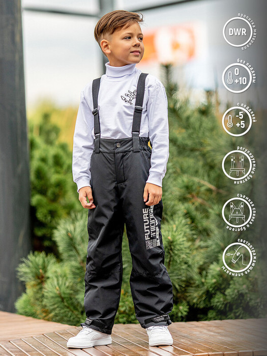 Брюки для мальчика Вегас демисезонные утепленные в темно-серой расцветке. Брюки-полукомбинезон для детей подойдут на весну и осень. Имеют эластичную талию и регулируемые съемные лямки. Подойдут для прогулки, занятий спортом, школы и детского сада.   Особенности:  Регулируемая талия Съёмные бретели Объёмные карманы на молнии Низ утягивается на декоративную пату и велкро для трансформации в джоггеры Светоотражающие канты и термотрансферы Водоотталкивающая пропитка ткани DWR Характеристики:Ткань верха: Мембрана Подклад: таффетаУтеплитель: 60 слайтекс Температурный режим от +10 до -5 СПроизводитель: batik