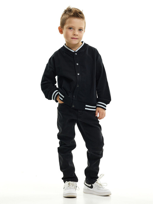 Бомбер для мальчика на кнопках из футера черный. Детская куртка-бомбер из натурального хлопка. Низ рукава с трикотажным манжетом, из того же трикотажного полотна выполнен воротник и обработан низ.Характеристики:Ткань: