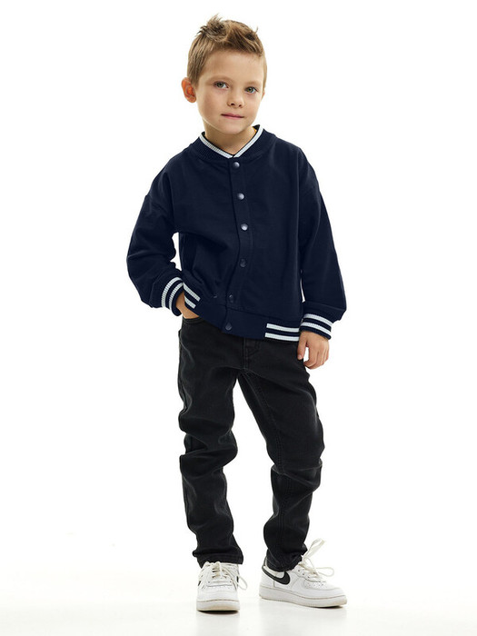 Бомбер для мальчика на кнопках из футера темно-синий. Детская куртка-бомбер из натурального хлопка. Низ рукава с трикотажным манжетом, из того же трикотажного полотна выполнен воротник и обработан низ. Характеристики:Ткань:Футер 2х нитка пенье 95% хлопок 5% эластанПроизводитель: batik