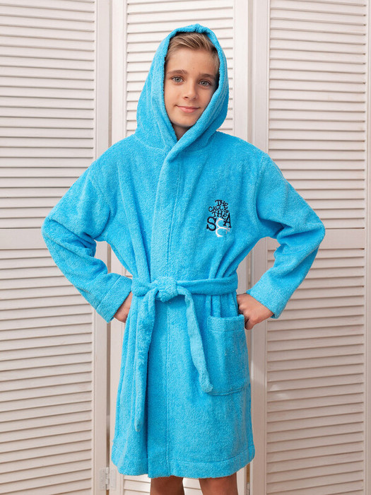 Халат для дома банный в бирюзовой расцветке для мальчиков. Яркий и красивый халат из двухсторонней махры с нашивкой на груди.Особенности:Наличие капюшонаКарман с одной стороныУдобный поясХарактеристики:Материал: махра двухсторонняяСостав: 100% хлопокРазмеры: 98 - 116Производитель: batik