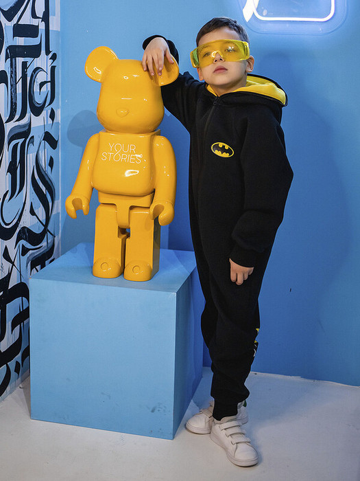 Комбинезон из футера детский Смит в черно-желтом цвете. Капюшон, застежка на молнию, эластичные манжеты рукавов и штанин. Принт с Бэтменом.
