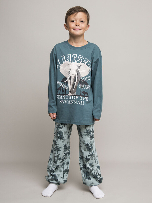 Детский пижамный комплект для мальчика из супрема пенье. Футболка зеленая с длинным рукавом и милым принтом в виде слона и надписями. Брюки со стильным тропическим принтом. Эластичная резинка на брюках для комфортного сна.Характеристики:Ткань: Супрем пенье 100% хлопокПроизводитель: batik