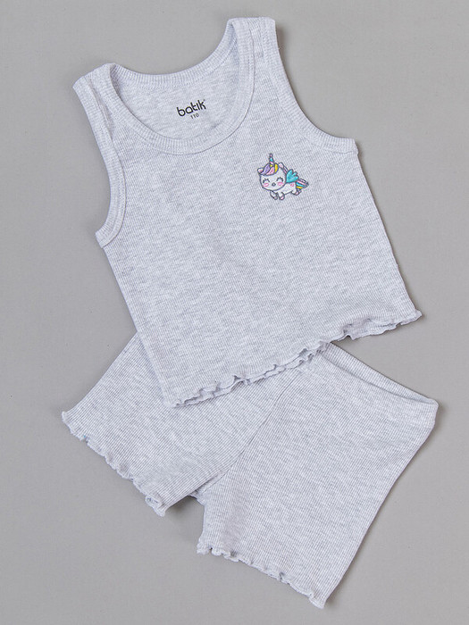 Комплект трикотажный для девочки из кашкорсе: майка-топ и шорты. Комплект одежды в сером цвете подойдет на жаркое лето. Выполнен из хлопкового полотна 95% хлопок и оформлен нашивкой в виде единорога. Шорты короткие на резинке. Фигурный край.Характеристики:Ткань: Кашкорсе 95% хлопок 5% эластанПроизводитель: batik