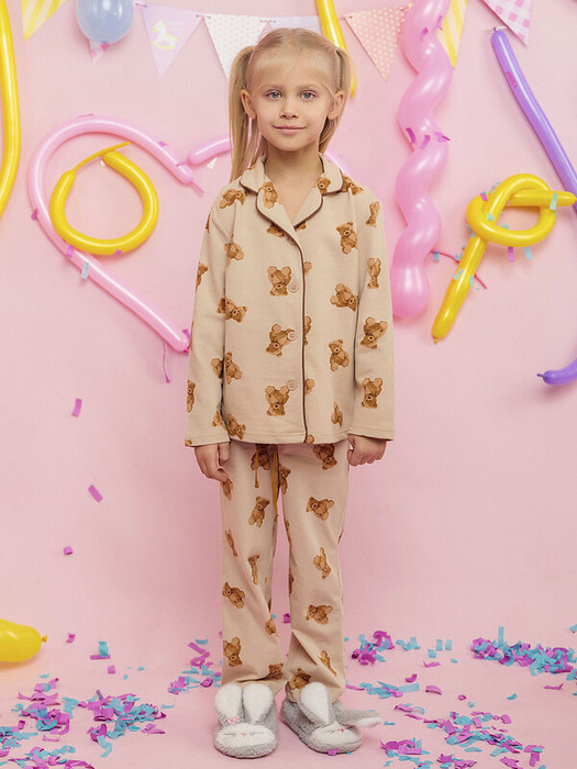 Пижама для девочки бежевая из футера: футболка с длинным рукавом и брюки. Пижамный универсальный костюм с принтом мишки понравится детям любого возраста. Он отлично подойдет для уютного ночного сна и повседневной носки. Футболка  имеет отвороты на воротнике и застежку на пуговицы по центру. Брюки свободного кроя на резинке.Характеристики:Ткань: Футер 2х нитка пенье 100% хлопокПроизводитель: batik