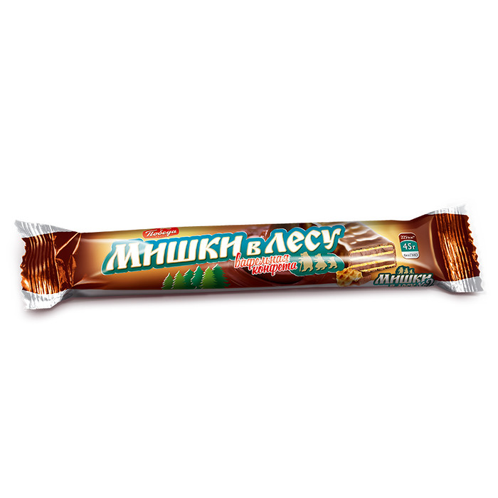 Шоколадный батончик «Мишки в лесу» – это нежная молочно-шоколадная начинка с кусочками хрустящей вафли, политая горьким шоколадом, в идеальном исполнении «Победы». Вкусно как в детстве!