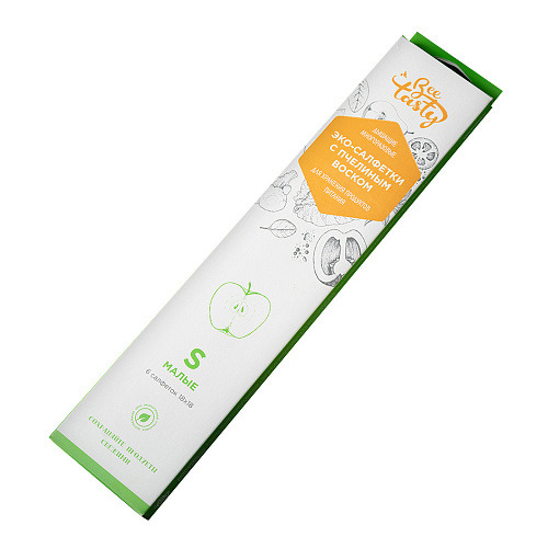 Экосалфетки для хранения продуктов питания с пчелиным воском упаковочные, хлопчатобумажные, многоразовые, дышащие, под торговой маркой Bee Tasty, 6 штук, размер S (малые 18х18 см.), в упаковке из картона позволяют долго сохранять свежесть, цвет и вкус продуктов, замедляют рост плесени и бактерий, сохраняют естественную влагу продуктов, удерживают форму салфетки при охлаждении и размягчают её от тепла рук, проявляют клейкость и гибкость.