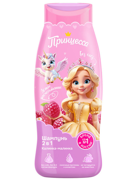 Специально подобранные экстракты. Продукция без красителей и аллергенов! Особая формула с кондиционером, экстрактами молока и малины бережно очищает локоны Принцессы.